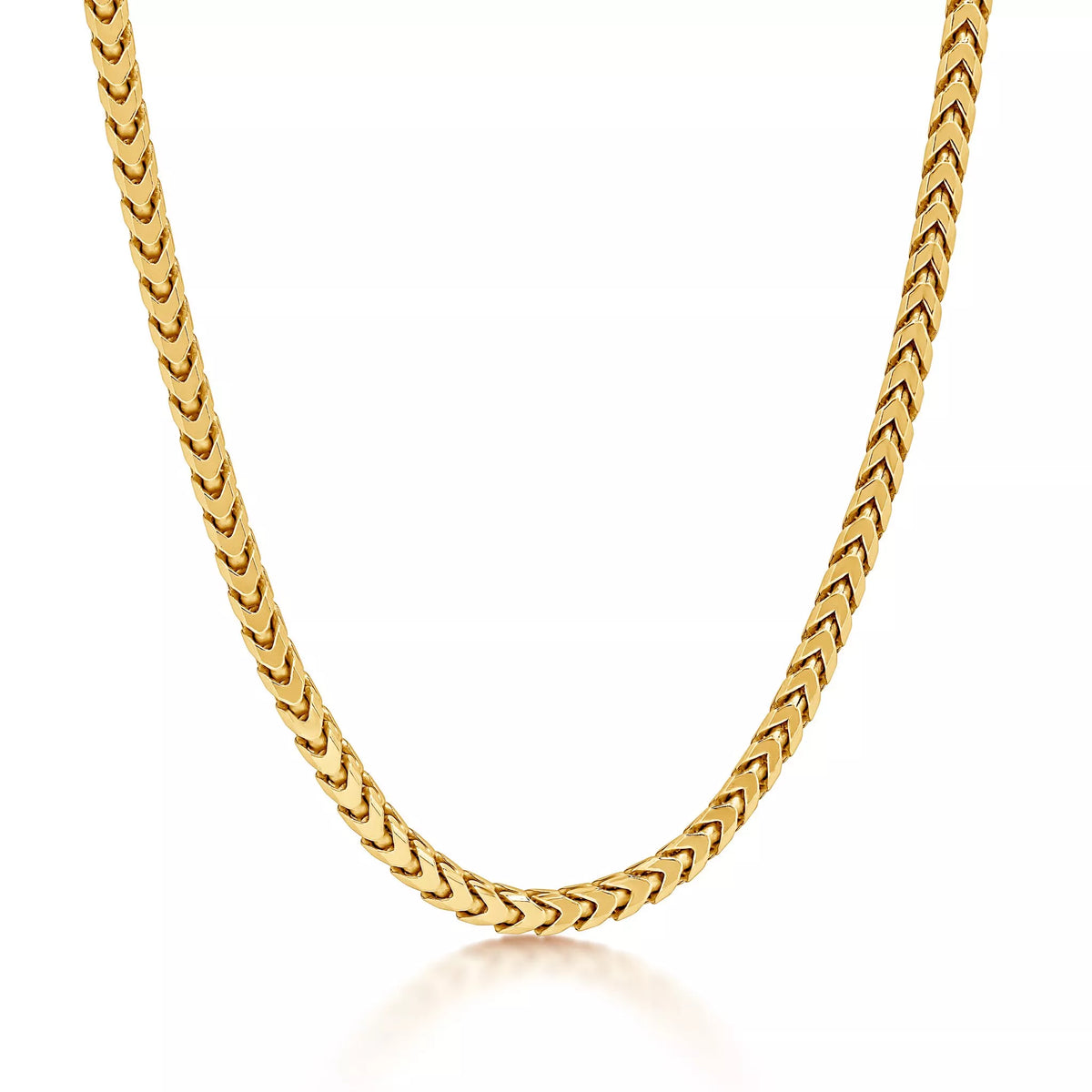 La chaîne Keays Franco de 3 mm incarne la solidité et la précision, avec des maillons en forme de V qui rappellent notre emblème. Son tressage offre une présence nette et polyvalente, à porter seule ou superposée.