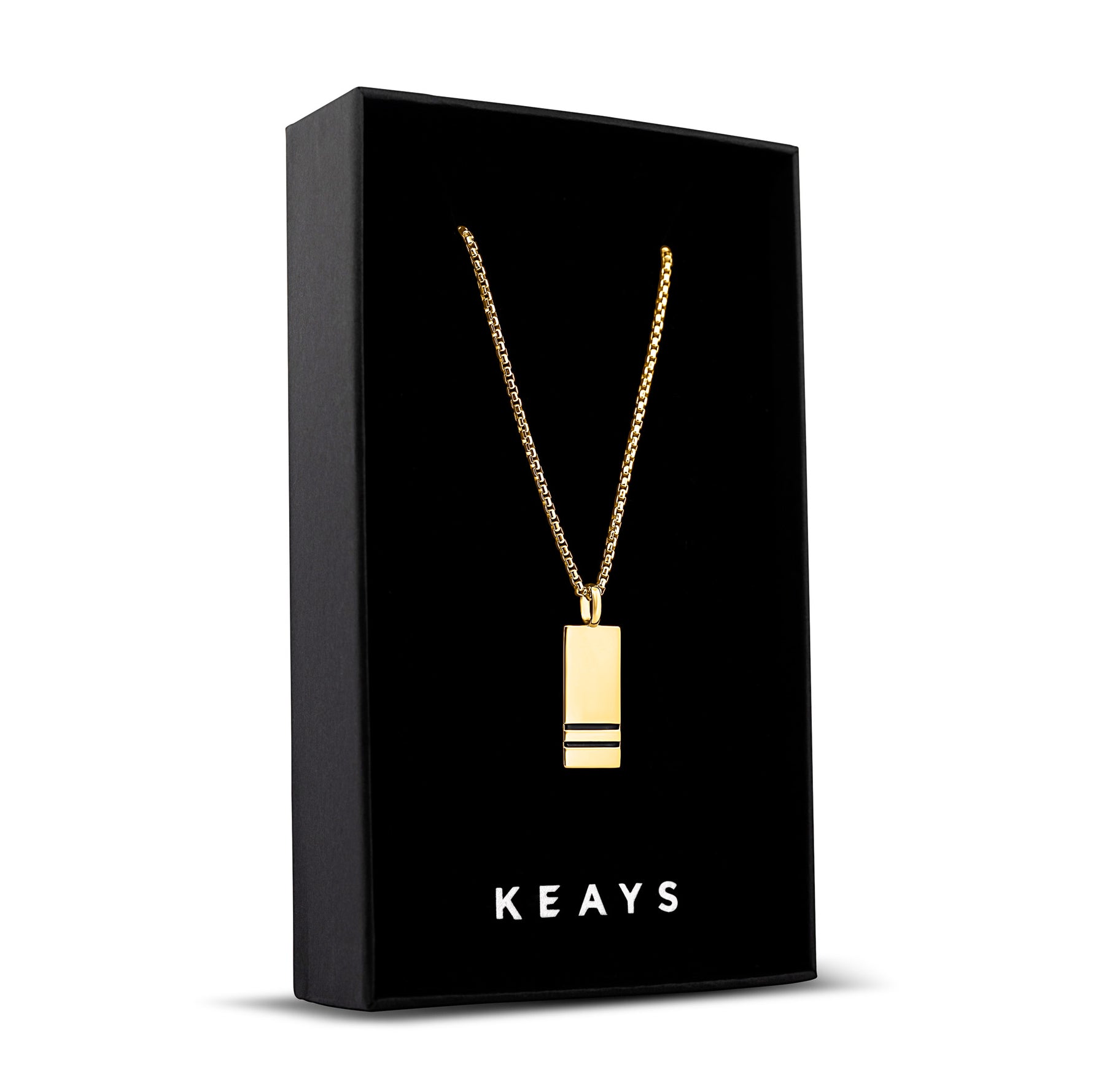 The Keays Apex Gold Pendant is a slim column of polished 18k gold, cut with two black lines for sharp contrast. At 15 mm, it delivers a clean, modern edge—best paired with our 1.8 mm Round Box Gold Chain.